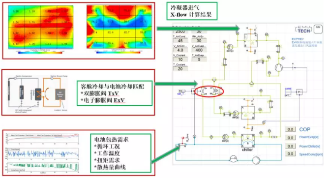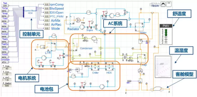 热管理系统功能设计优化,是热管理系统解决方案的核心。由需求模型转化而来的热管理系统模型包含完整的接口信息,这些信息包括系统设计各个目标值,与其他系统的输入输出接口参数(ICM),给热管理各子部件或子系统的输出要求等。达索系统公司1D软件Dymola的热管理库(TIY)是目前市面上为数不多的支持基于几何模型仿真换热器性能的软件(不依赖于测试数据),可以在前期概念设计阶段就虚拟分析热管理系统匹配和虚拟标定控制策略(FMU嵌入算法),实现系统模型与控制标定模型同步开发和相互迭代优化。