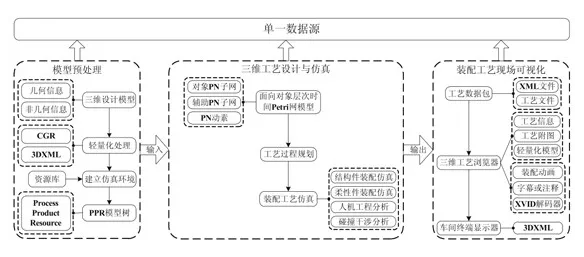 图1 三维装配工艺设计与仿真及现场可视化技术总体框架