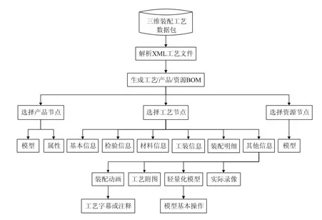 将装配环境中设计完成的三维工艺数据包发布到车间现场,主要包括XML工艺规划文件和其他工艺文件。在车间终端显示器上,通过三维工艺浏览器读取XML工艺文件,浏览三维工艺设计信息:BOM信息(工艺、产品、资源)、工艺信息、工艺附图、装配仿真动画、字幕或注释文件、三维轻量化模型等。从XML文件中读取的工艺信息和工艺文件夹中的工艺资源均与浏览器中的BOM节点相关联。