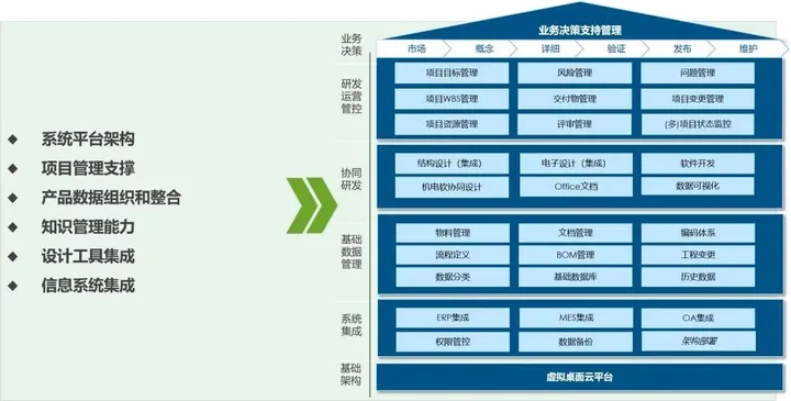 以项目管理为纲固化并优化研发流程、管控产品在研发过程中的技术状态、打通产品开发流程中的数据链路为建设目标;实现数据的有序规范、设计过程的优化和资源的共享及上下游数据的一致,确保不同业务部门、工作岗位产生的数据之间的互联互通;