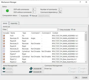 要从 CATIA 机构创建 Dymola 模型,您必须定义一个零自由度的机构。这很重要,因为它确保模型在模拟中表现可预测。在 CATIA 中,您将使用机构管理器来验证这一点,寻找除了一个受控自由度之外完全受约束的机构。