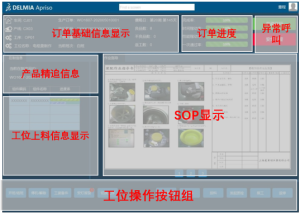 针对第一点,系统有良好的用户界面,APRISO区别于市面上其他的MOM产品只能让用户被动接受界面布局的现状,APRISO可以灵活的配置用户界面。以下是某工厂一线生产作业人员的用户界面,在该界面中显示了订单信息、当前质量情况、工序SOP以及生产线需要的一些操作按钮如叫料、异常呼叫、报修等等。