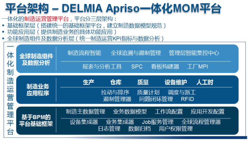 Apriso产品架构图显示了 Apriso平台的深度和广度,填补了制造操作所需的广泛功能范围。下面两层是安装用于管理工厂内制造操作的应用程序。一共五个主要模块:使用自适应BPM平台构建的生产,仓库,质量,时间与人力和维护。这些模块是使用称为Process Builder的业务流程管理(BPM)构建的。这意味着应用程序具有高度可配置性,因为它们由易于更改的流程和作业组成的。其中还包含了其他模块:调度板,质量计划等,它们扩展了这些应用程序的功能。最上层包含组成Apriso全球制造套件(GMS)的模块。GMS集成了流程,性能和生产,为 Apriso的多个实例提供实时可见性。该体系结构的“顶”表示包括ERP,PLM,CRM和SCM等多种业务系统中的任何一种。DELMIA Apriso从运营领域(例如生产,仓库等)收集数据,并确保将数据集成到业务系统中。同样,信息可以从业务系统流向业务领域。例如,DELMIA Apriso可以从ERP或PLM系统接收检验计划,并在车间执行计划,收集计划中规定的数据并反馈回ERP\PLM。