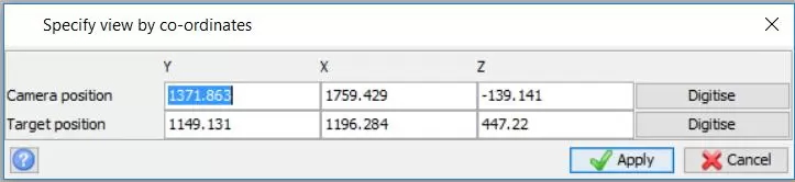 2. 如果定义了摄像机的 3D 坐标 (X,Y,Z) 和目标位置,请将坐标输入到下面的表格中。如果没有,请单击数字化按钮并在图形中以图形方式选择它们。请注意,相机和目标位置应该是不同的值(不允许相同位置)。