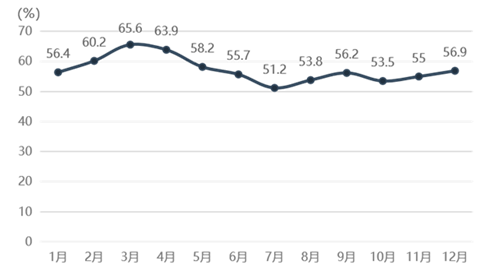 12月建筑业商务活动指数(PMI)为56.9%,比上月上升1.9个百分点。