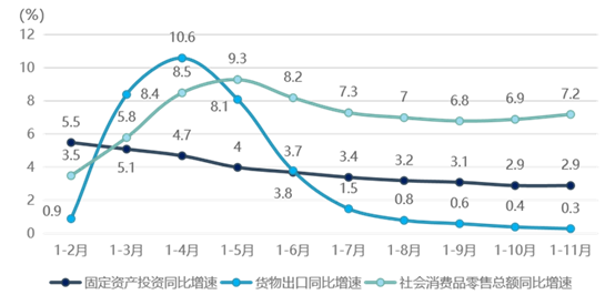 - 2023年1-11月我国固定资产投资、消费、出口情况