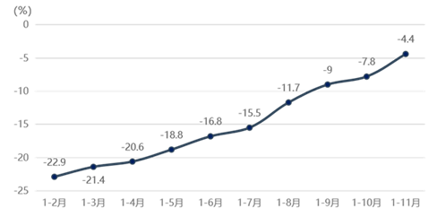 1—11月份,全国房地产开发投资104045亿元,同比下降9.4%(按可比口径计算);其中,住宅投资78852亿元,下降9.0%。1—11月份,商品房销售面积100509万平方米,同比下降8.0%,其中住宅销售面积下降7.3%。商品房销售额105318亿元,下降5.2%,其中住宅销售额下降4.3%。1—11月份,房地产开发企业到位资金117044亿元,同比下降13.4%。其中,国内贷款14227亿元,下降9.8%;利用外资42亿元,下降35.1%;自筹资金38505亿元,下降20.3%;定金及预收款39583亿元,下降10.9%;个人按揭贷款19982亿元,下降8.1%。