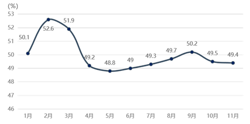 11月份,制造业采购经理指数(PMI)为49.4%,比上月下降0.1个百分点,制造业景气水平略有回落。