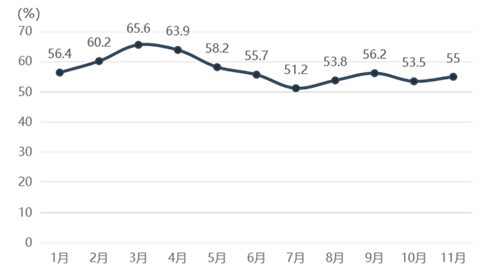 11月份,建筑业PMI指数为55.0%,比上月上升1.5个百分点。