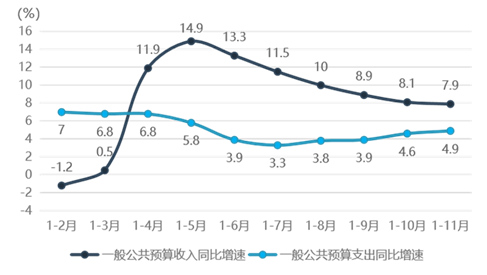 1-11月累计,全国一般公共预算收入200131亿元,同比增长7.9%。其中,税收收入168420亿元,同比增长10.2%;非税收入31711亿元,同比下降3%。分中央和地方看,中央一般公共预算收入91692亿元,同比增长6.9%;地方一般公共预算本级收入108439亿元,同比增长8.7%。1-11月累计,全国一般公共预算支出238462亿元,同比增长4.9%。分中央和地方看,中央一般公共预算本级支出33295亿元,同比增长5.8%;地方一般公共预算支出205167亿元,同比增长4.8%。