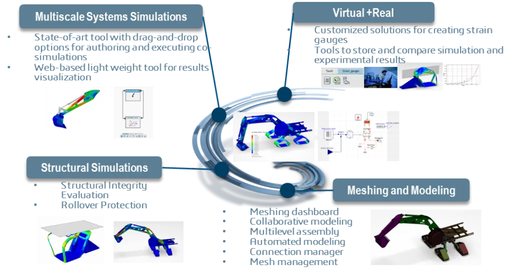 现在,模拟在新产品开发中发挥着更重要的作用。仿真用于大型、复杂的项目,例如挖掘机仿真,不仅需要评估结构完整性,而且还需要深入了解系统的性能。