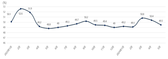 5月份,制造业采购经理指数(PMI)为49.5%,比上月下降0.9个百分点,制造业景气水平有所回落。