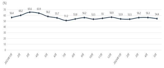 5月建筑业商务活动指数(PMI)为54.4%,比上月下降1.9个百分点。
