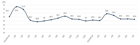 7月份,制造业采购经理指数(PMI)为49.4%,比上月略降0.1个百分点,制造业景气度基本稳定。