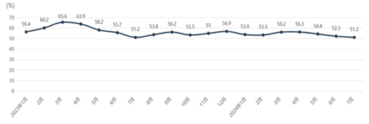 7月建筑业商务活动指数(PMI)为51.2%,比上月下降1.1个百分点。