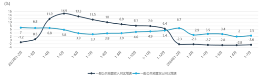1—7月,全国一般公共预算支出155463亿元,同比增长2.5%。分中央和地方看,中央一般公共预算本级支出21444亿元,同比增长9.3%;地方一般公共预算支出134019亿元,同比增长1.5%。