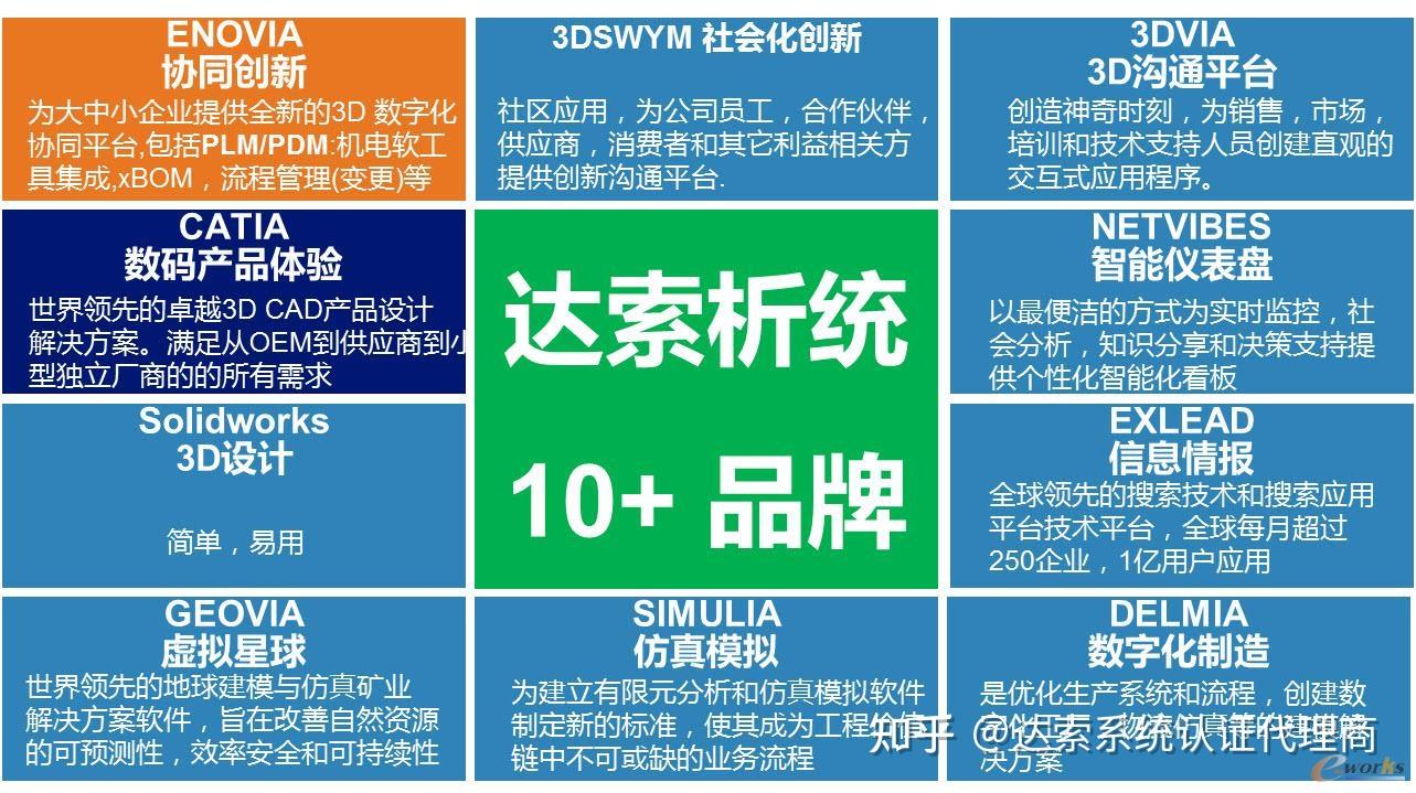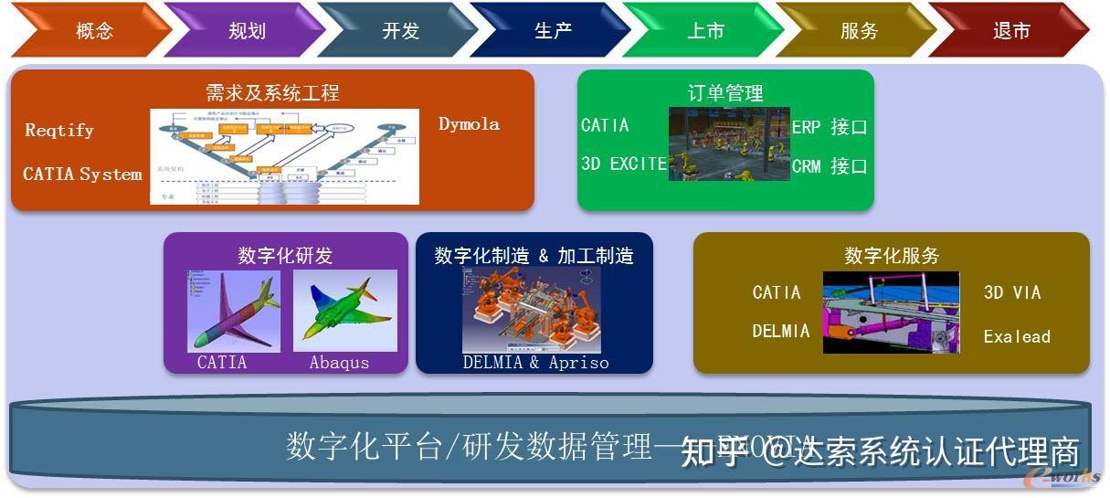 达索系统从产品的概念提出,到产品规划、设计开发、生产、上市、售后服务、退出市场等环节都有产品进行支撑,最终实现共平台的企业数字化研发统一数据源协同研发平台。