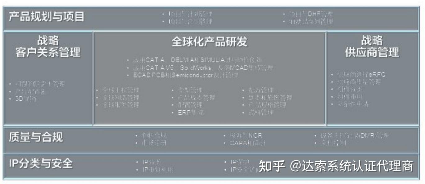 将以上的业务过程进行细化, 能够将业务过程细分为很多主要功能项, 比如在产品研发阶段, 包括应用CATIA、 SolidWorks等MCAD工具进行产品结构设计,利用ECAD工具进行产品电路设计, 应用Delmia进行工艺管理和工厂布局, 应用Simulia进行产品仿真分析, 并且通过与SAP等ERP系统集成, 利用企业已有的信息化系统, 全面支撑企业的产品研发与生产的全生命周期管理。