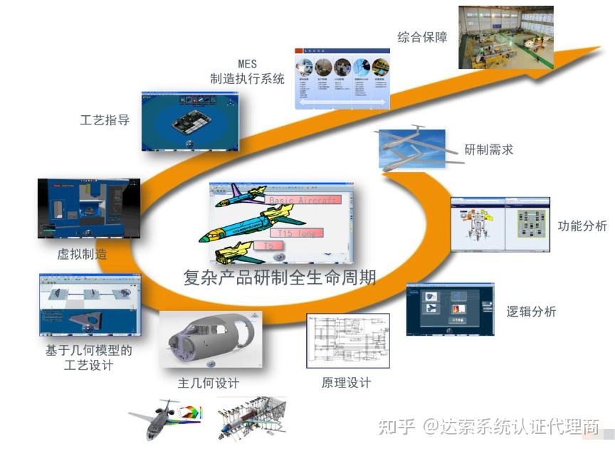 从工业产品研制生产阶段来看,达索析统提供了从研制需求开始,进行功能分析、逻辑分析、原理设计、结构设计和仿真、工艺设计、虚拟制造、工艺规程、加工制造和售后保障等功能支撑。