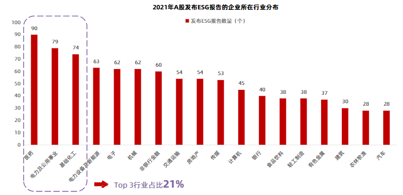 从细分行业来看,2021年A股发布ESG报告数量最多的行业为医药行业,总计90家企业披露了自己的ESG报告。受疫情影响,大部分医药行业的企业均在其ESG报告中披露了自2020年来的抗疫举措,如药明生物、翰森制药、复星医药等。电力及公用事业行业与基础化工行业紧随其后,分别有79、74家发布了ESG报告,阐述了其在环保等领域的举措。