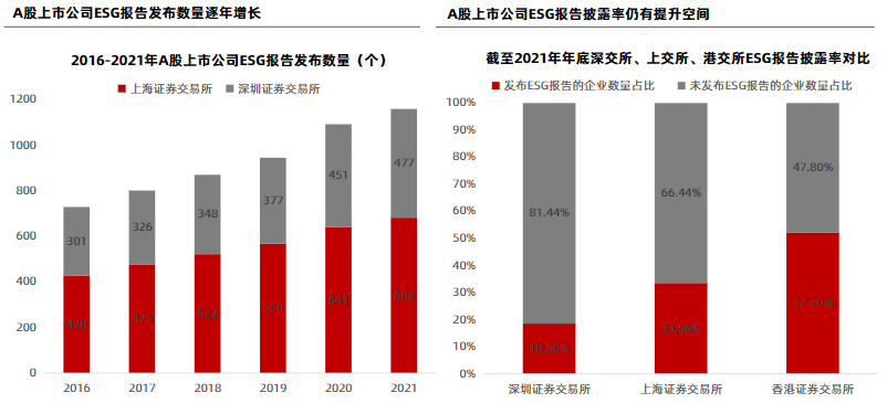 截至2021年年底,与H股52.2%的ESG报告披露率相比,深交所与上交所的披露率仅为18.56%与33.56%,表明我国内地企业的ESG发展起步较晚,A股上市公司ESG报告披露率仍存在一定提升空间。