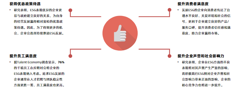 研究表明,良好的ESG表现有利于企业获得主要利益相关者的认同,让企业获得更高的非经济价值,例如得到优惠的政策待遇、提升消费者满意度、员工满意度,从而提升声誉和社会影响力,使其在市场中处于优势地位。在这些非经济价值因素的驱动下,许多企业积极承担ESG责任,进行ESG实践。