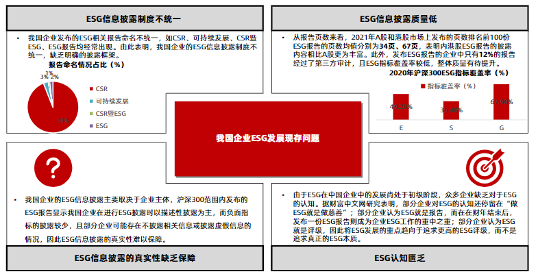 但是目前我国在ESG领域中还存在一些问题:ESG信息披露与ESG认知参差不齐