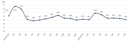 8月份,制造业采购经理指数(PMI)为49.1%,比上月下降0.3个百分点,制造业景气度小幅回落。