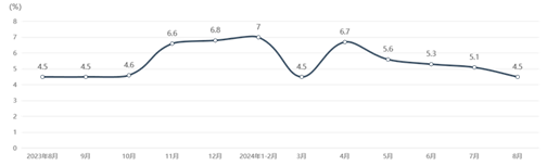8月份,规模以上工业增加值同比实际增长4.5%(增加值增速均为扣除价格因素的实际增长率)。从环比看,8月份,规模以上工业增加值比上月增长0.32%。1—8月份,规模以上工业增加值同比增长5.8%。