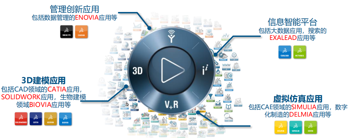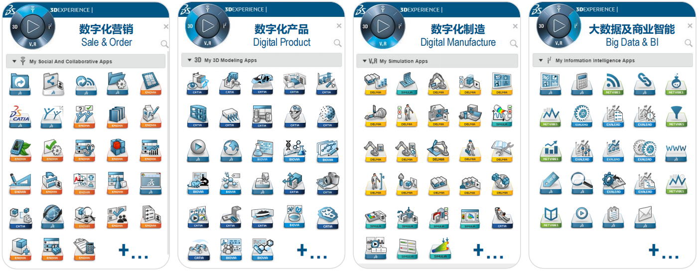 3DExperience平台是一个包括设计、仿真、分析工具(CATIA、DELMIA、SIMULIA、……)、协同环境(VPM) 、产品数据管理(ENOVIA) 、社区协作 (3DSwym) 、大数据技术(EXALEAD) 等多种应用的一体化平台。