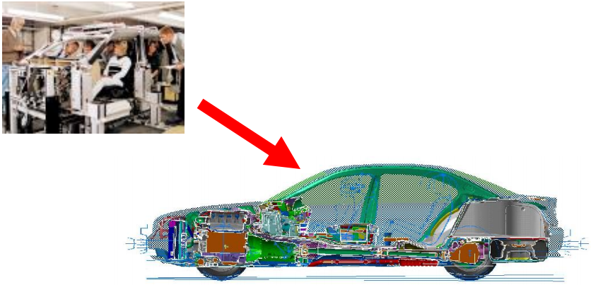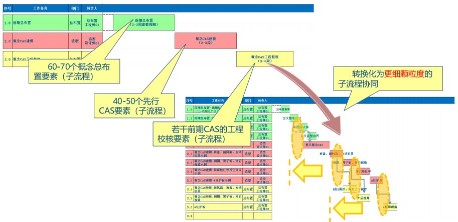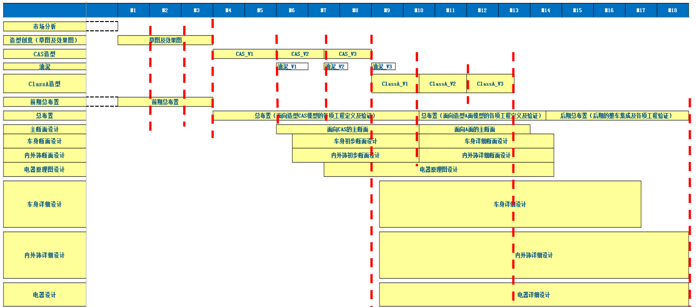 图示为一个较传统的换代车型的 造型-总布置流程。 红色虚线表示一个个节点,各专 业的协同基于节点的数据交换展开, 每一个版本的周期约是1-2个月;