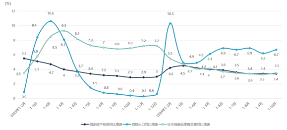 - 2024年1-10月我国固定资产投资、消费、出口情况