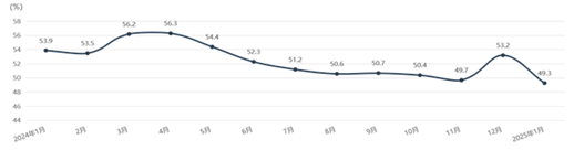 1月建筑业商务活动指数(PMI)为49.3%,比上月下降3.9个百分点。