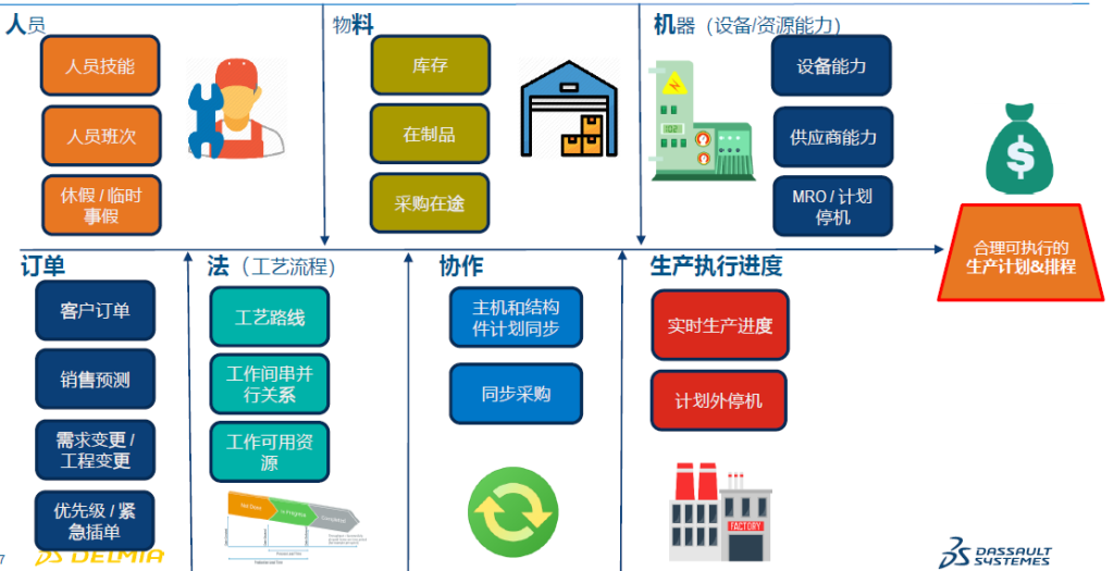 DELMIA Ortems 高级计划和排程解决方案成功补充了传统 ERP 系统和 SCM 管理系统。它们增加了基于约束的有限容量资源优化以及从原材料到成品的生产流程同步的能力。