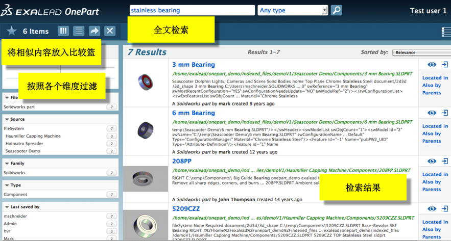 通过简单的检索与筛选,EXALEAD OnePart可以在几秒内快速检索到用户所需的可能的设计模型,通过零件的属性查询:如零件号、颜色、项目名称、档案类别、原始设计者名字等从原文档获取而来的这些信息,或者通过属性对比,即可快速找到目标的文件。