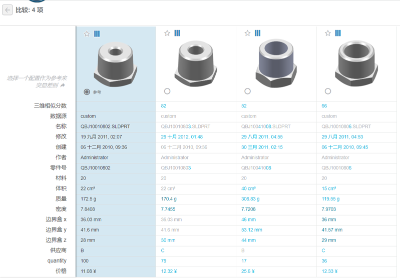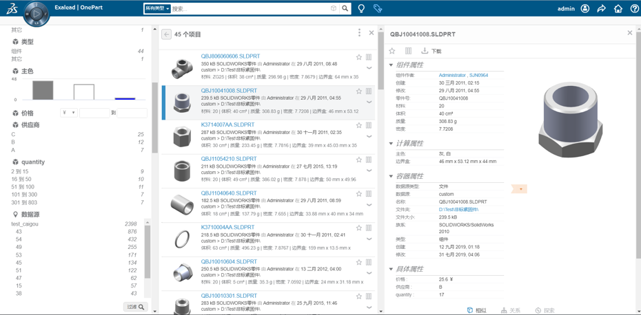 达索系统Exalead OnePart产品以其独特的几何相似性搜索能力,通过对模型几何形状的分析,一键自动检索相似模型,并可进行详细对比和物料信息查看,方便工程师快捷进行历史相似物料借用,减少重复设计,大大降低企业成本。
