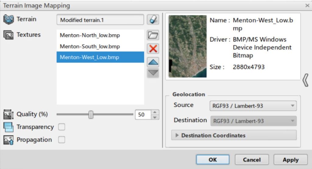 19x版本中进一步加强了地形贴图功能,在设置地形贴图界面,加入了设置地形贴图质量、地形贴图透明度,以及贴图继承功能。