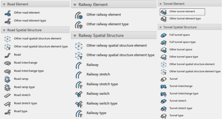 在2019x平台中,这一切功能都得到了继承,并且也最新加入了道路、铁路、隧道、大坝、路基等AEC类型,用户无需再自行创建这些AEC类型。
