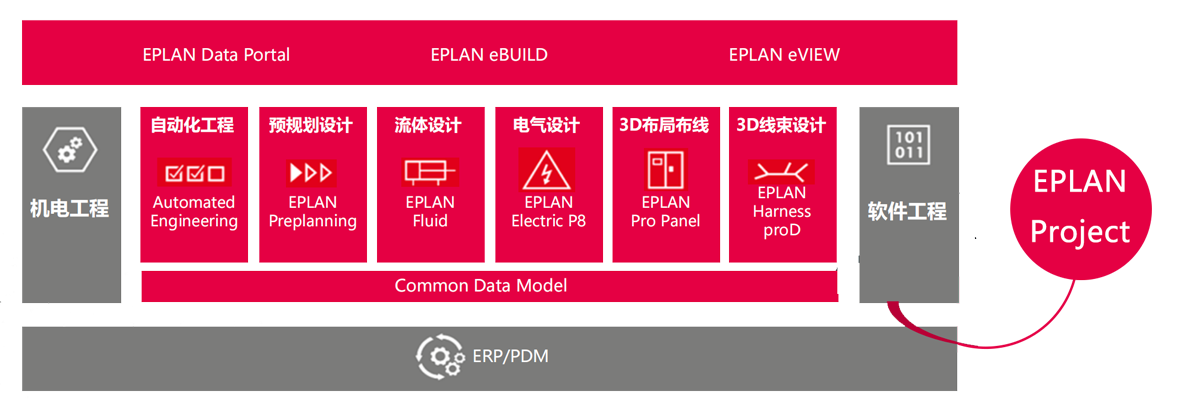 EPLAN 平台连接了电气工程、流体动力工程、EI&C 工程以及控制柜制造等各个工程学科的专家系统。所有应用程序都配备相同的基本数据和功能,支持高水平的项目质量和机电一体化工作方法。
