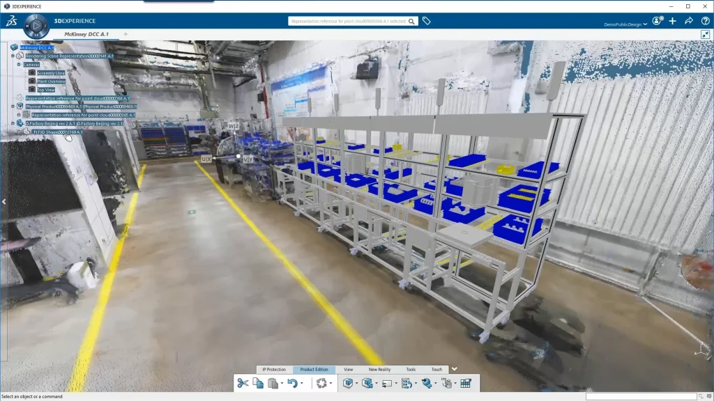当使用3D扫描仪扫描实际的工厂设备时,会创建一个点云。PLA具有将点云导入虚拟工厂布局的能力。这提供了现有设施的精确复制品,可以通过从现有资源目录将 3D 设备导入到点云上来进一步增强。用户可以在 3DEXPERIENCE 平台内部移动、操作和测量点云。此外,它还提供了“清洁点云”功能,用于消除点云中包含的任何“噪声”,而“网格”功能可用于将点云细化为表面数据。当导入大量数据时,用户可以导入 E57 文件格式的点云。