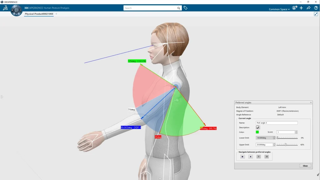 人体工程学专家可以创建范围广泛的边界人体模型、目标人群和特定个体,以(与其他人体工程学过程一起)用于特定评估。EMA 使创建这些栩栩如生的人体模型以在 3DEXPERIENCE 平台中使用变得简单。人体工程学专家还可以调整这些人体模型的运动范围,并通过姿势评分来准备姿势分析。