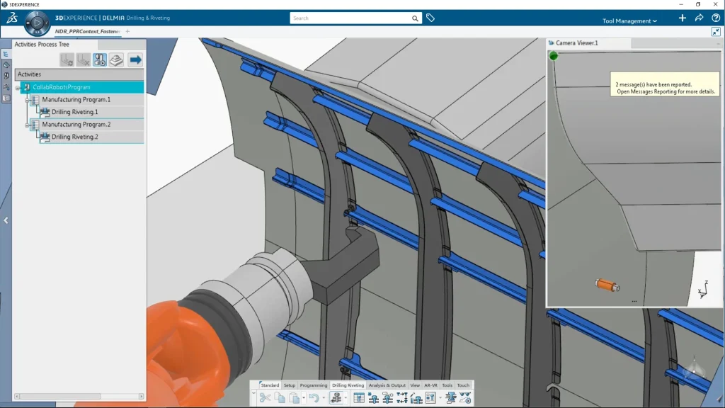 DELMIA 3DEXPERIENCE Fabrication Riveting System Programmer for Aerospace Role 为 NC 机床编程人员提供了一个 3D 环境,使他们能够在 3DEXPERIENCE 平台中创建、模拟、验证和优化由 NC 控制器操作驱动的复杂钻孔和铆接机或机器人的生产程序。