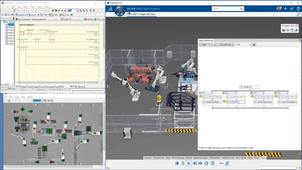 用户可以将机器人仿真连接到 CATIA Control Build,以验证工作单元的自动化控制。在这种情况下,PLC 程序中的逻辑验证可以在实际工作单元构建之前开始,从而可以在生产工程阶段的早期验证控制代码,这大大减少了系统试用和生产所需的时间。