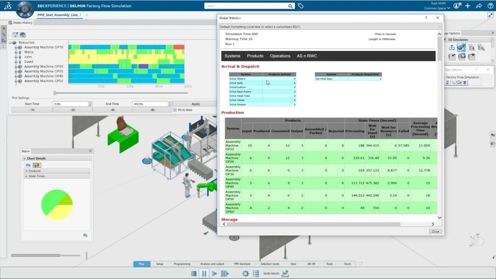 通过使用多种属性,工程师可以调整大量值并运行 3D 模拟,以实现有效流程。例如,他们可以将工人分配到转运点,并根据产品重量调整工人速度和转运时间。他们可以根据机器人或数控机床的时间要求调整传送带速度。