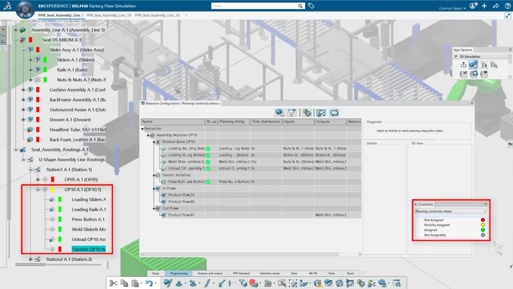 工程师可以在逼真的 3D 环境中定义、模拟和分析多种生产场景,从而设计工厂布局。如果没有工艺规划数据,他们可以从头开始,定位资源并设计物料流。他们可以定义生产设备、生产线行为和物料流逻辑。如果资源编程已经完成,机器人和数控机床程序以及人工任务将原生集成到模型中,并可以进行模拟。