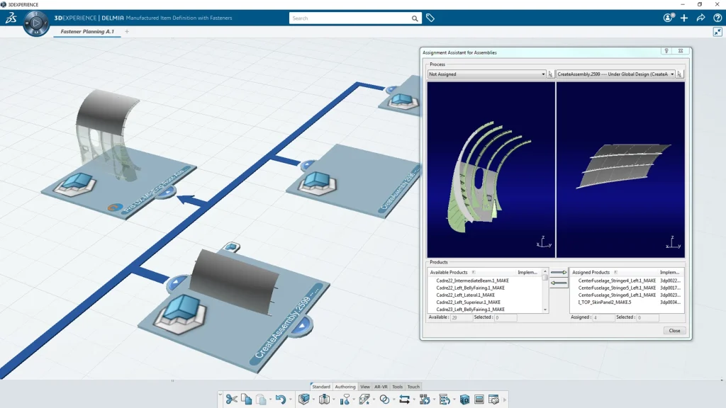 紧固件工艺工程师可以自动生成初始制造项目结构(又名制造物料清单)并将其显示为 3D 装配图,根据工程设计的输入产品结构详细说明主要装配体和子装配体。用户可以通过创建制造特定组件来重新组织结构,并通过简单地在 3D 中拖放来将零件或组件从一个节点重新分配到另一个节点。
