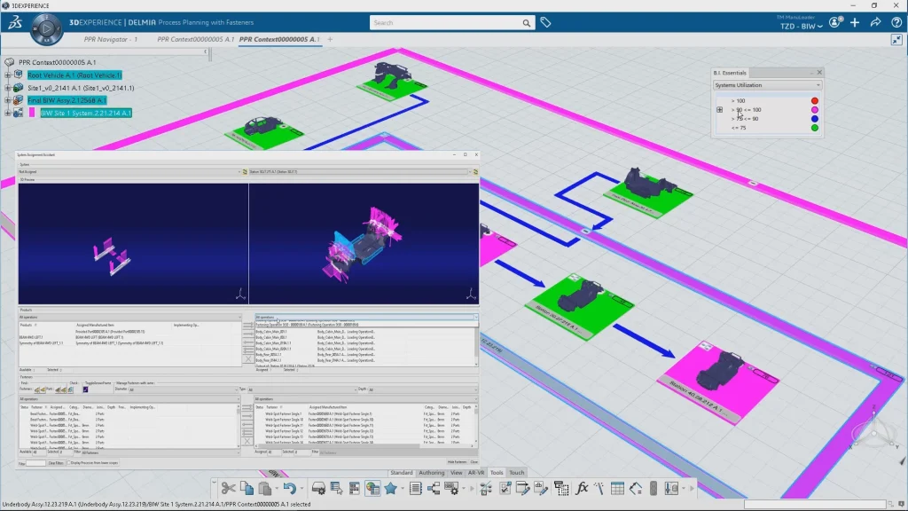 一些高级工具和界面,如甘特图、3D Pert View(或 3D 工艺流程图)、紧固件分配助手或条形图面板,有助于优化工作站或工作单元之间生产线上的紧固件分布。他们可以评估总时间与所需的周期时间和所需工人或机器人的数量,并通过在装配过程中重新分配紧固件来重新平衡。
