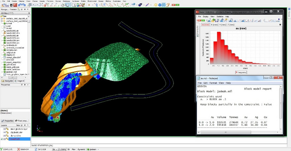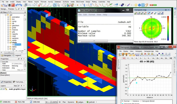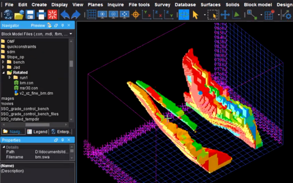 可视化和分析钻孔和其他表面采样与测量。执行合成、截面地质建模、地表和地下地质对象网格化和栅格化,以及适用于明挖作业、基于台阶的块品位控制计算。