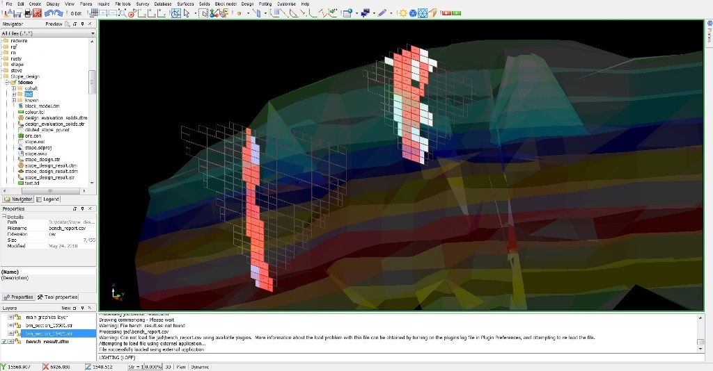 将战略性矿区平面图转换为实用的矿区设计,包括矿井表面、斜坡、隧道、运料道路、废料堆,同时还能生成矿藏报告和矿区平面图。包含所有设计范畴,包括每日、每周、每月和长期。