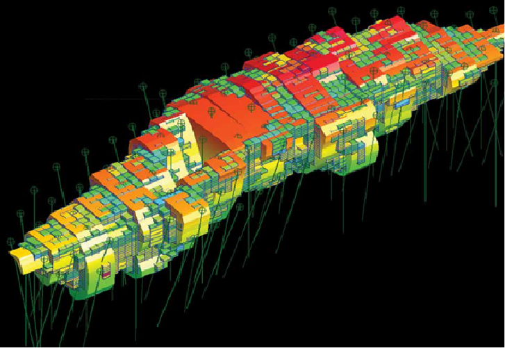 分析土方特性的空间变异性,并创建整合一系列特性的正则化体积模型。为明挖作业执行基于台阶的块品位控制计算。